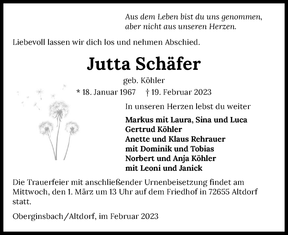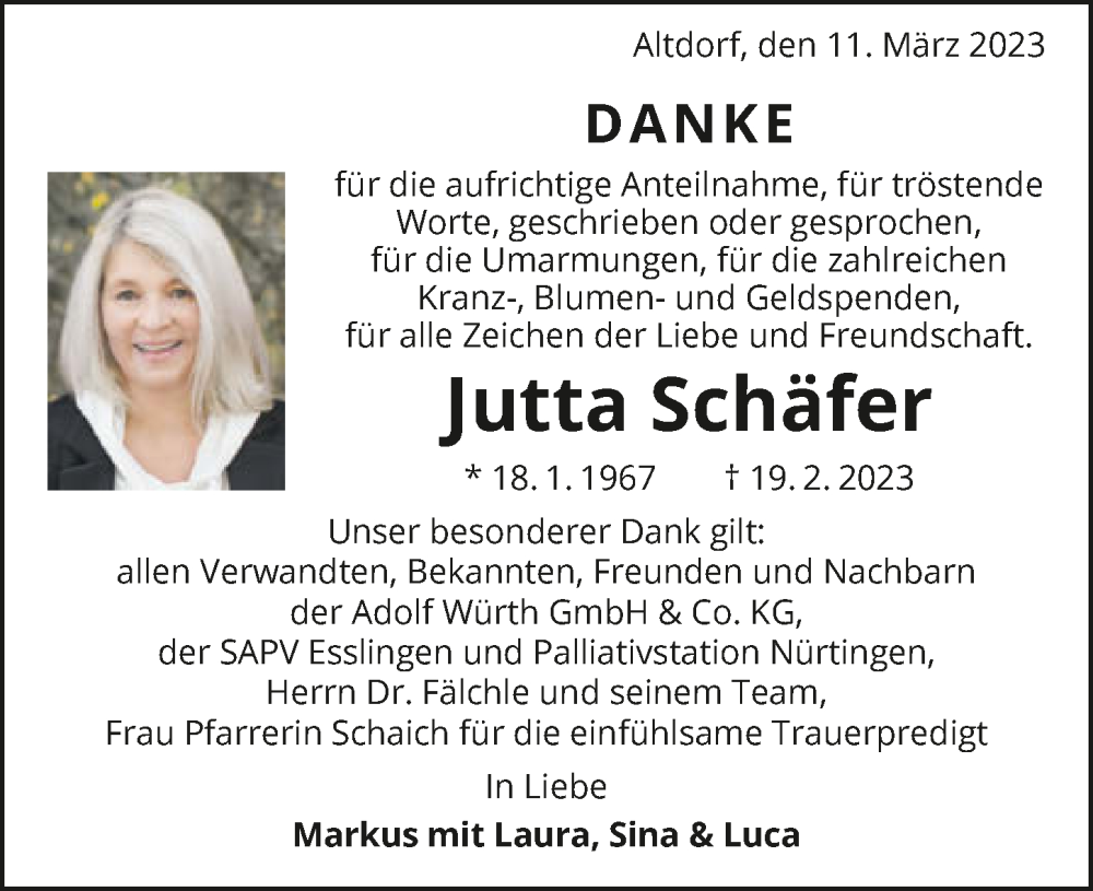 Hier finden Sie alle Traueranzeigen aus der Zeitung, die bisher für Jutta Schäfer erschienen sind. Weitere Traueranzeigen, die in der Zeitung erscheinen, werden hier ebenfalls aufgelistet