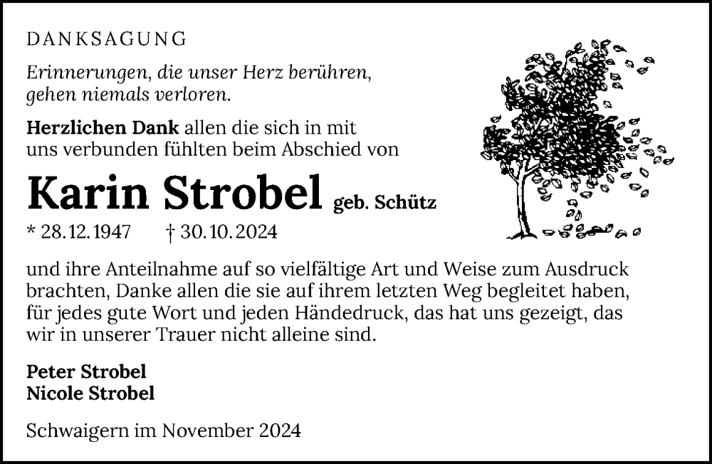 Hier finden Sie alle Traueranzeigen aus der Zeitung, die bisher für Karin Strobel erschienen sind. Weitere Traueranzeigen, die in der Zeitung erscheinen, werden hier ebenfalls aufgelistet