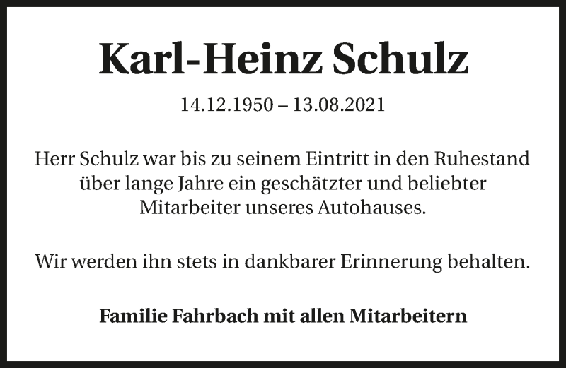 Hier finden Sie alle Traueranzeigen aus der Zeitung, die bisher für Karl-Heinz Schulz erschienen sind. Weitere Traueranzeigen, die in der Zeitung erscheinen, werden hier ebenfalls aufgelistet