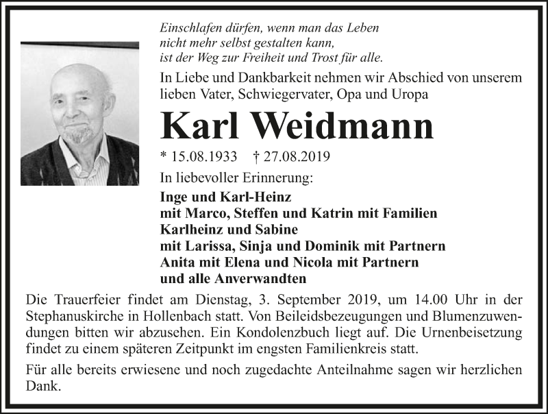 Hier finden Sie alle Traueranzeigen aus der Zeitung, die bisher für Karl Weidmann erschienen sind. Weitere Traueranzeigen, die in der Zeitung erscheinen, werden hier ebenfalls aufgelistet