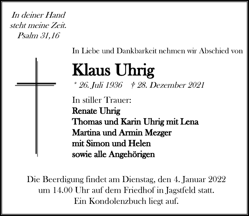 Hier finden Sie alle Traueranzeigen aus der Zeitung, die bisher für Klaus Uhrig erschienen sind. Weitere Traueranzeigen, die in der Zeitung erscheinen, werden hier ebenfalls aufgelistet