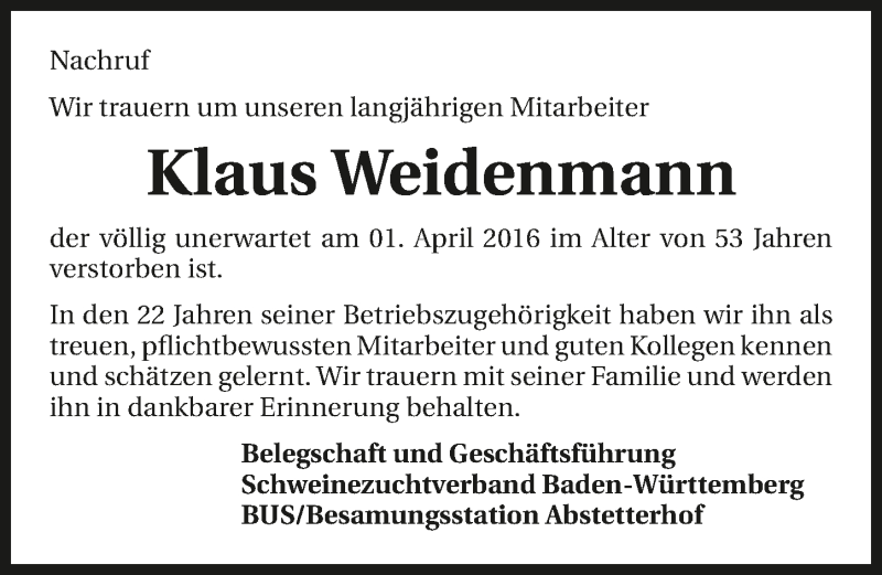 Hier finden Sie alle Traueranzeigen aus der Zeitung, die bisher für Klaus Weidenmann erschienen sind. Weitere Traueranzeigen, die in der Zeitung erscheinen, werden hier ebenfalls aufgelistet