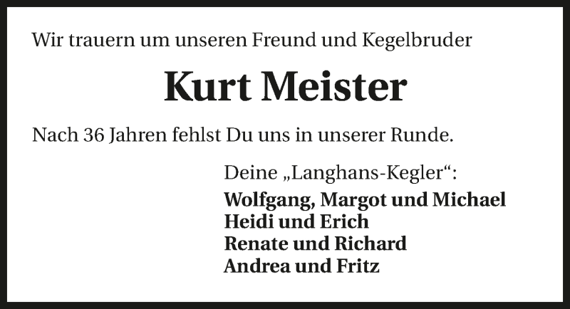 Hier finden Sie alle Traueranzeigen aus der Zeitung, die bisher für Kurt Meister erschienen sind. Weitere Traueranzeigen, die in der Zeitung erscheinen, werden hier ebenfalls aufgelistet