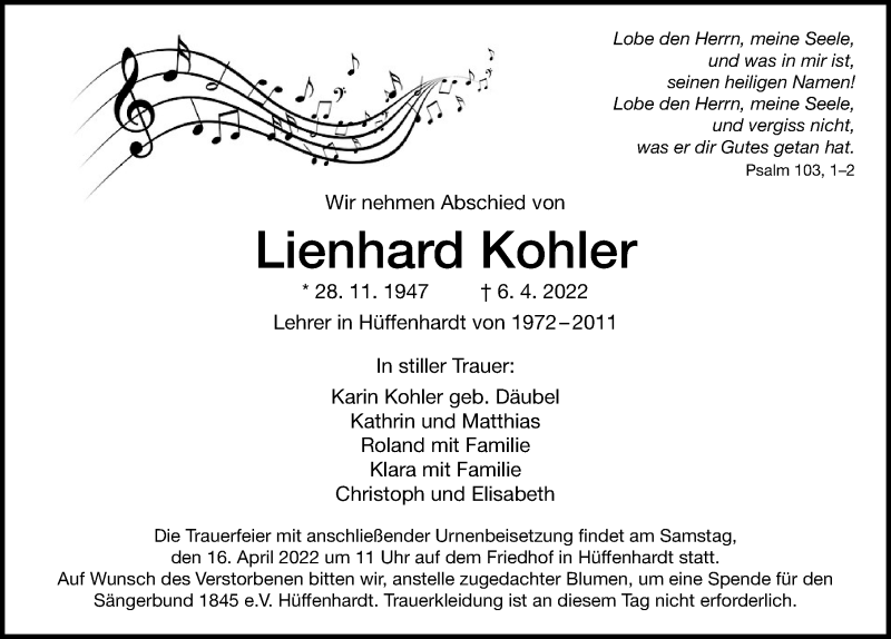 Hier finden Sie alle Traueranzeigen aus der Zeitung, die bisher für Lienhard Kohler erschienen sind. Weitere Traueranzeigen, die in der Zeitung erscheinen, werden hier ebenfalls aufgelistet