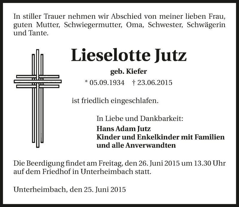 Hier finden Sie alle Traueranzeigen aus der Zeitung, die bisher für Lieselotte Jutz erschienen sind. Weitere Traueranzeigen, die in der Zeitung erscheinen, werden hier ebenfalls aufgelistet