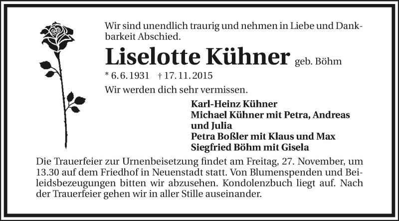 Hier finden Sie alle Traueranzeigen aus der Zeitung, die bisher für Liselotte Kühner erschienen sind. Weitere Traueranzeigen, die in der Zeitung erscheinen, werden hier ebenfalls aufgelistet