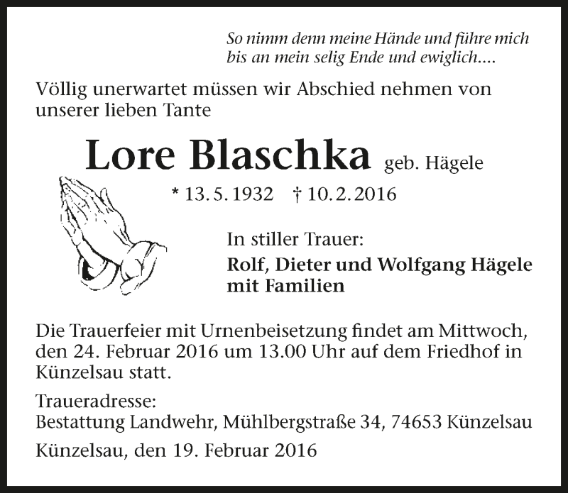 Hier finden Sie alle Traueranzeigen aus der Zeitung, die bisher für Lore Blaschka erschienen sind. Weitere Traueranzeigen, die in der Zeitung erscheinen, werden hier ebenfalls aufgelistet