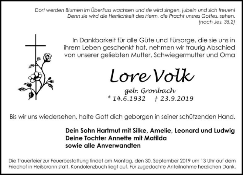 Hier finden Sie alle Traueranzeigen aus der Zeitung, die bisher für Lore Volk erschienen sind. Weitere Traueranzeigen, die in der Zeitung erscheinen, werden hier ebenfalls aufgelistet