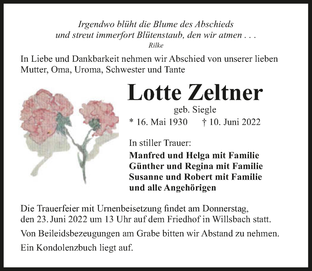 Hier finden Sie alle Traueranzeigen aus der Zeitung, die bisher für Lotte Zeltner erschienen sind. Weitere Traueranzeigen, die in der Zeitung erscheinen, werden hier ebenfalls aufgelistet