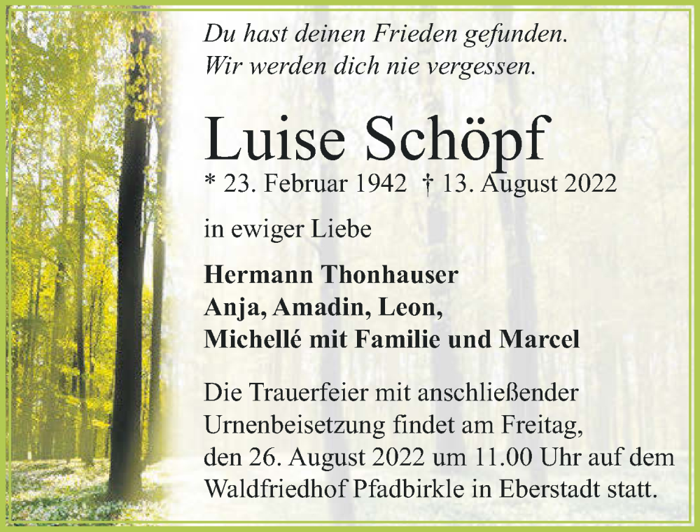 Hier finden Sie alle Traueranzeigen aus der Zeitung, die bisher für Luise Schöpf erschienen sind. Weitere Traueranzeigen, die in der Zeitung erscheinen, werden hier ebenfalls aufgelistet