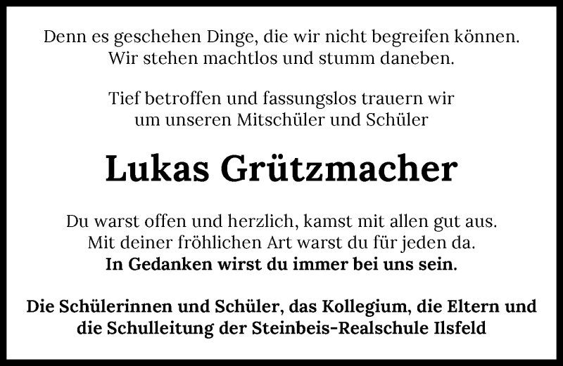 Hier finden Sie alle Traueranzeigen aus der Zeitung, die bisher für Lukas Grützmacher erschienen sind. Weitere Traueranzeigen, die in der Zeitung erscheinen, werden hier ebenfalls aufgelistet