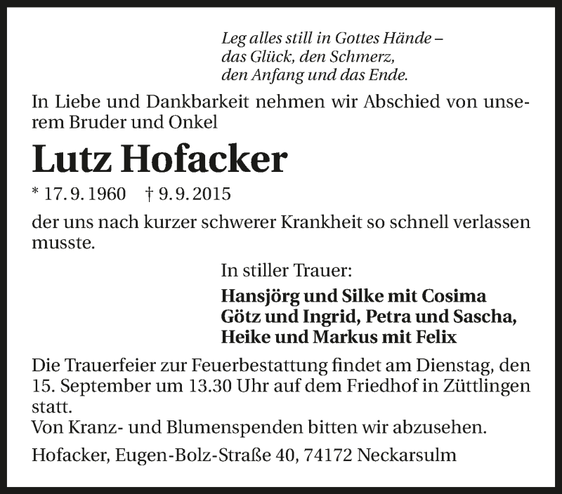 Hier finden Sie alle Traueranzeigen aus der Zeitung, die bisher für Lutz Hofacker erschienen sind. Weitere Traueranzeigen, die in der Zeitung erscheinen, werden hier ebenfalls aufgelistet