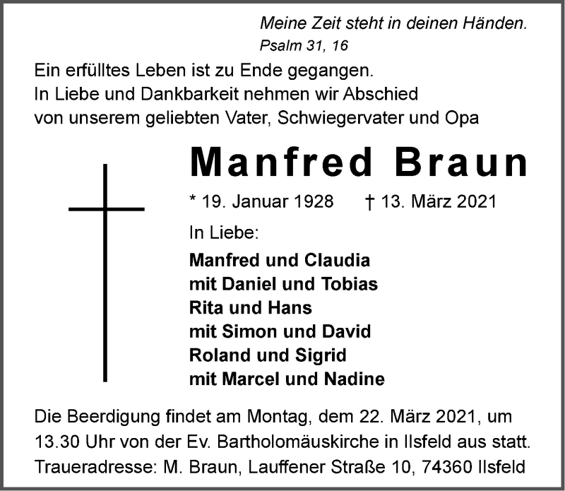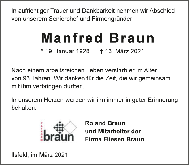 Hier finden Sie alle Traueranzeigen aus der Zeitung, die bisher für Manfred Braun erschienen sind. Weitere Traueranzeigen, die in der Zeitung erscheinen, werden hier ebenfalls aufgelistet
