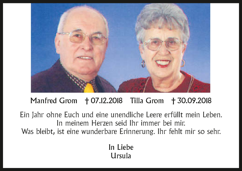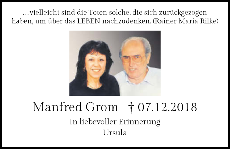 Hier finden Sie alle Traueranzeigen aus der Zeitung, die bisher für Manfred Grom erschienen sind. Weitere Traueranzeigen, die in der Zeitung erscheinen, werden hier ebenfalls aufgelistet