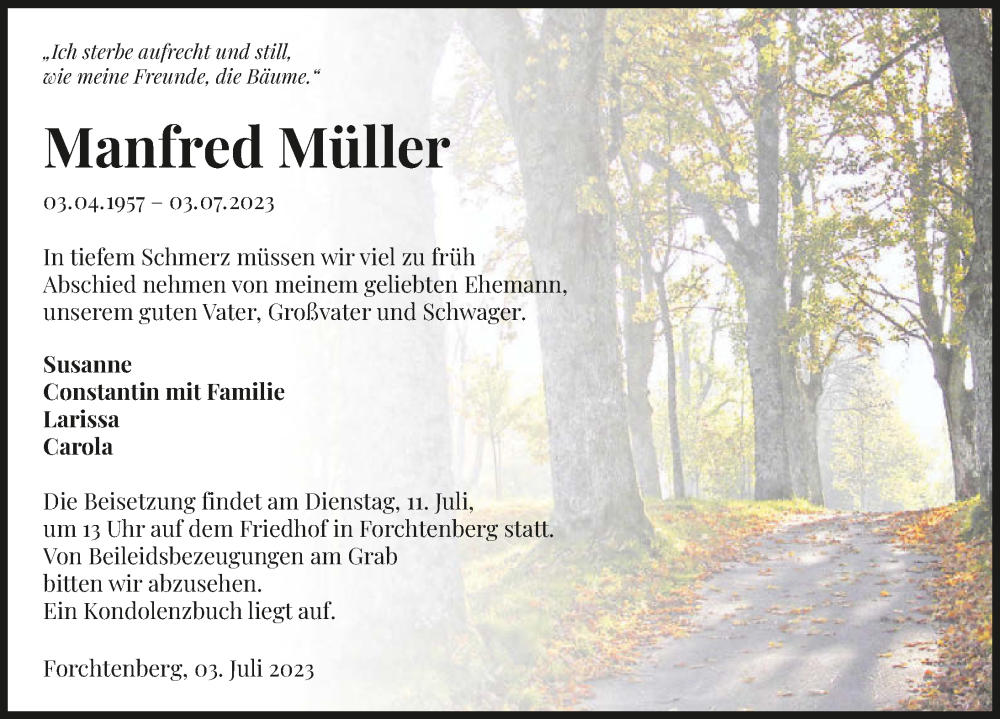 Hier finden Sie alle Traueranzeigen aus der Zeitung, die bisher für Manfred Müller erschienen sind. Weitere Traueranzeigen, die in der Zeitung erscheinen, werden hier ebenfalls aufgelistet