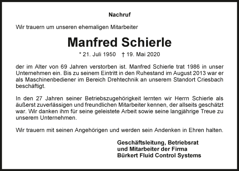 Hier finden Sie alle Traueranzeigen aus der Zeitung, die bisher für Manfred Schierle erschienen sind. Weitere Traueranzeigen, die in der Zeitung erscheinen, werden hier ebenfalls aufgelistet