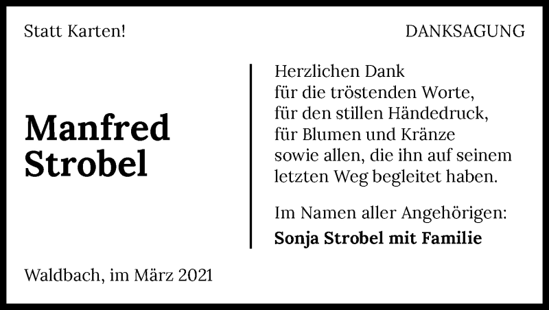 Hier finden Sie alle Traueranzeigen aus der Zeitung, die bisher für Manfred Strobel erschienen sind. Weitere Traueranzeigen, die in der Zeitung erscheinen, werden hier ebenfalls aufgelistet