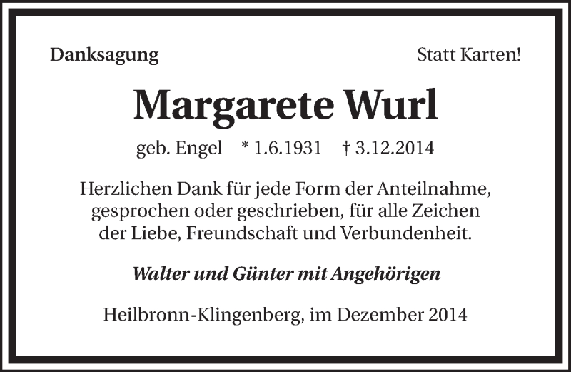 Hier finden Sie alle Traueranzeigen aus der Zeitung, die bisher für Margarate Wurl erschienen sind. Weitere Traueranzeigen, die in der Zeitung erscheinen, werden hier ebenfalls aufgelistet