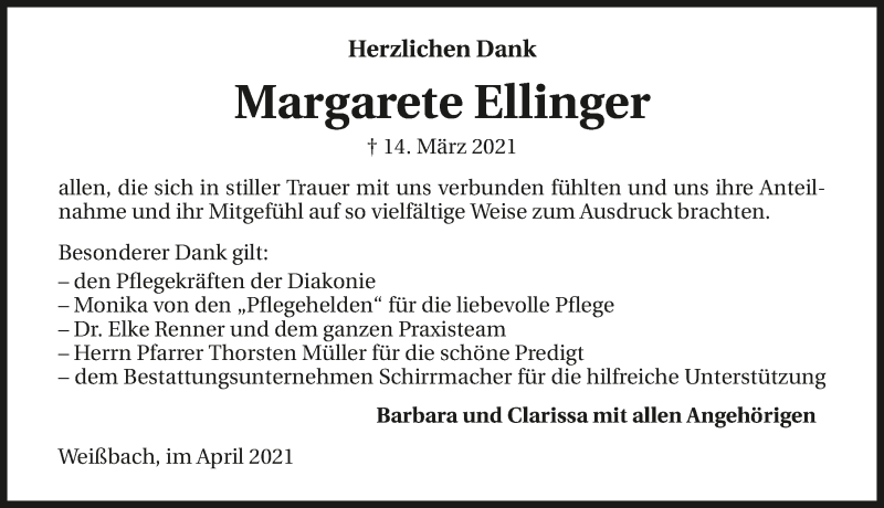 Hier finden Sie alle Traueranzeigen aus der Zeitung, die bisher für Margarete Ellinger erschienen sind. Weitere Traueranzeigen, die in der Zeitung erscheinen, werden hier ebenfalls aufgelistet