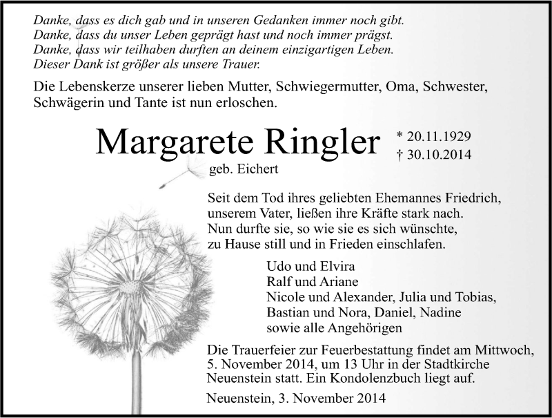 Hier finden Sie alle Traueranzeigen aus der Zeitung, die bisher für Margarete Ringler erschienen sind. Weitere Traueranzeigen, die in der Zeitung erscheinen, werden hier ebenfalls aufgelistet