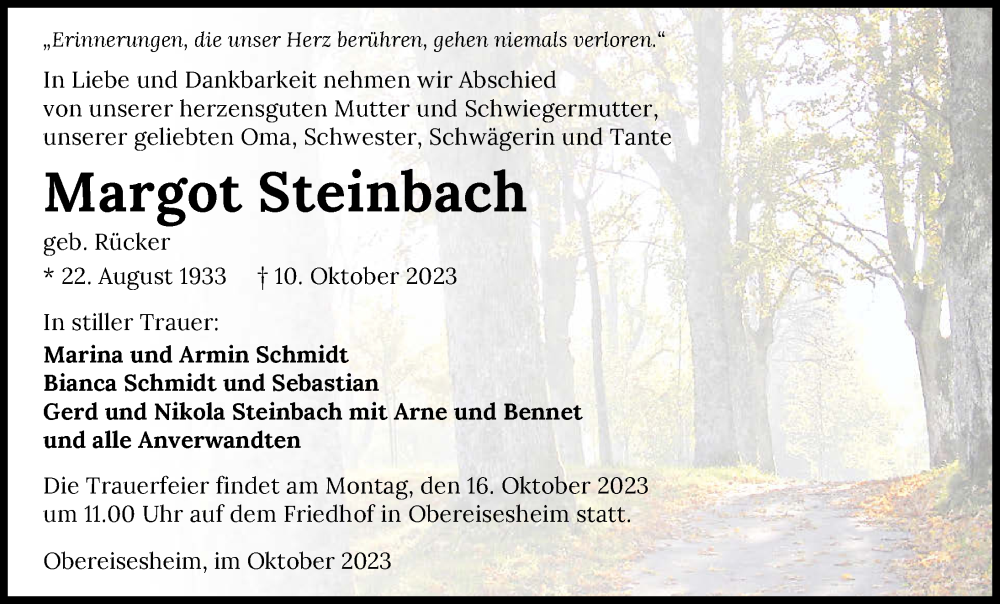 Hier finden Sie alle Traueranzeigen aus der Zeitung, die bisher für Margot Steinbach erschienen sind. Weitere Traueranzeigen, die in der Zeitung erscheinen, werden hier ebenfalls aufgelistet