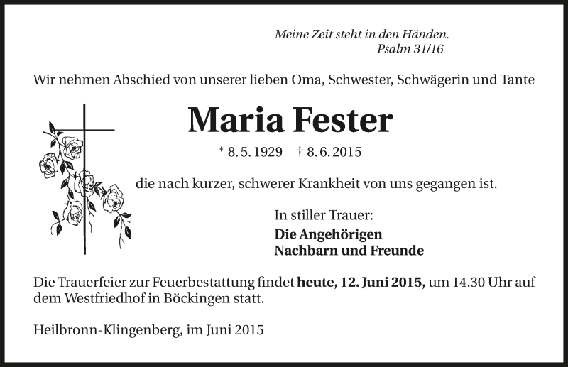 Hier finden Sie alle Traueranzeigen aus der Zeitung, die bisher für Maria Fester erschienen sind. Weitere Traueranzeigen, die in der Zeitung erscheinen, werden hier ebenfalls aufgelistet