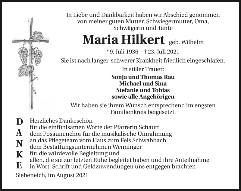 Hier finden Sie alle Traueranzeigen aus der Zeitung, die bisher für Maria Hilkert erschienen sind. Weitere Traueranzeigen, die in der Zeitung erscheinen, werden hier ebenfalls aufgelistet