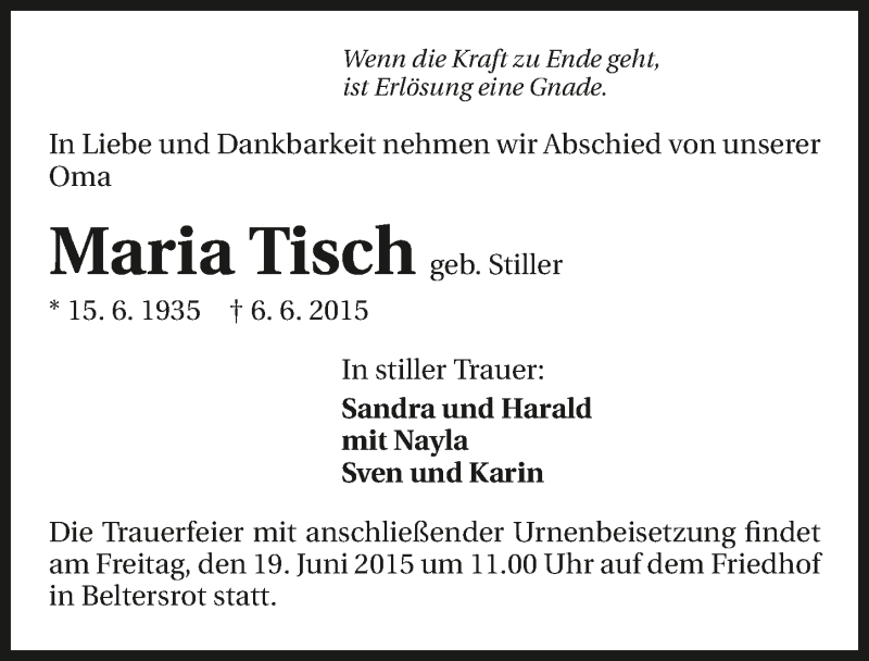 Hier finden Sie alle Traueranzeigen aus der Zeitung, die bisher für Maria Tisch erschienen sind. Weitere Traueranzeigen, die in der Zeitung erscheinen, werden hier ebenfalls aufgelistet