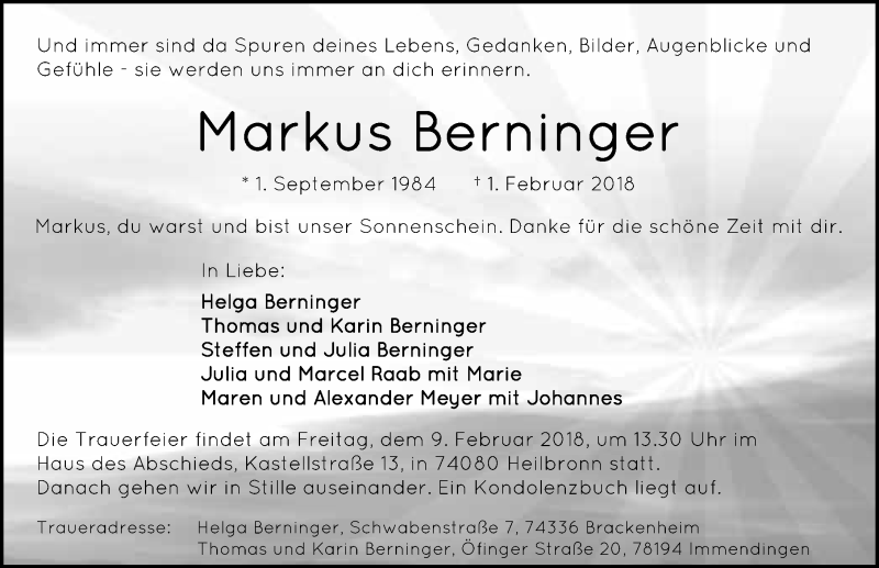 Hier finden Sie alle Traueranzeigen aus der Zeitung, die bisher für Markus Berninger erschienen sind. Weitere Traueranzeigen, die in der Zeitung erscheinen, werden hier ebenfalls aufgelistet