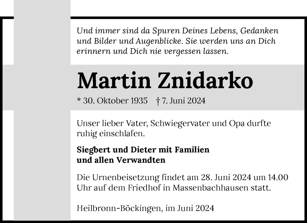 Hier finden Sie alle Traueranzeigen aus der Zeitung, die bisher für Martin Znidarko erschienen sind. Weitere Traueranzeigen, die in der Zeitung erscheinen, werden hier ebenfalls aufgelistet