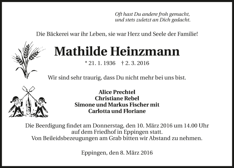 Hier finden Sie alle Traueranzeigen aus der Zeitung, die bisher für Mathilde Heinzmann erschienen sind. Weitere Traueranzeigen, die in der Zeitung erscheinen, werden hier ebenfalls aufgelistet