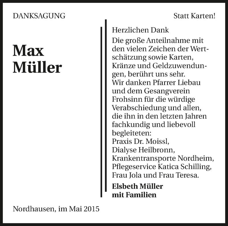 Hier finden Sie alle Traueranzeigen aus der Zeitung, die bisher für Max Müller erschienen sind. Weitere Traueranzeigen, die in der Zeitung erscheinen, werden hier ebenfalls aufgelistet