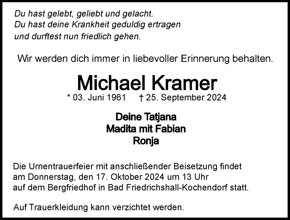 Hier finden Sie alle Traueranzeigen aus der Zeitung, die bisher für Michael Kramer erschienen sind. Weitere Traueranzeigen, die in der Zeitung erscheinen, werden hier ebenfalls aufgelistet