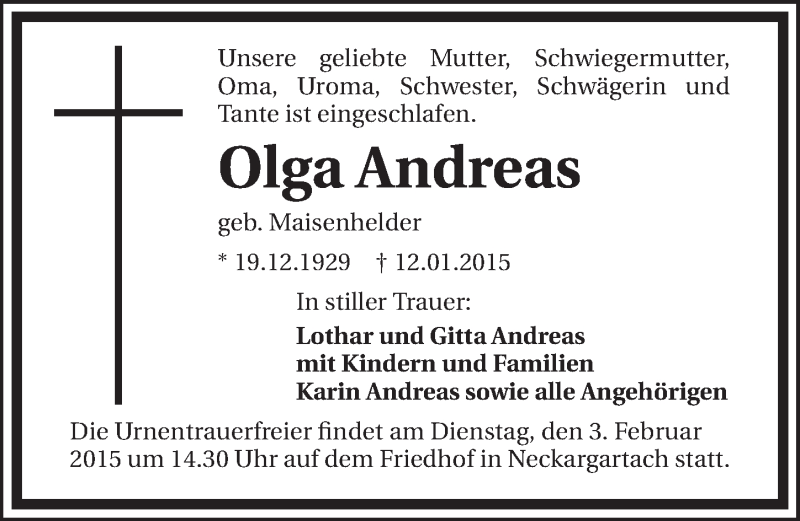 Hier finden Sie alle Traueranzeigen aus der Zeitung, die bisher für Olga Andreas erschienen sind. Weitere Traueranzeigen, die in der Zeitung erscheinen, werden hier ebenfalls aufgelistet