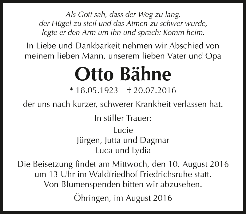 Hier finden Sie alle Traueranzeigen aus der Zeitung, die bisher für Otto Bähne erschienen sind. Weitere Traueranzeigen, die in der Zeitung erscheinen, werden hier ebenfalls aufgelistet