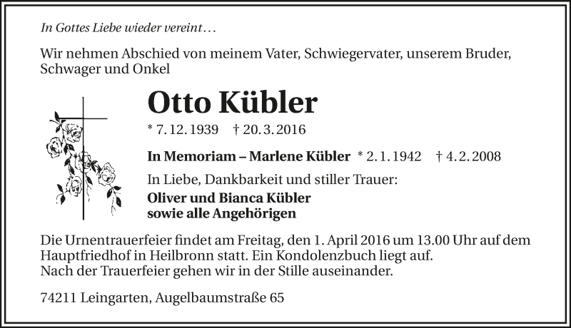 Hier finden Sie alle Traueranzeigen aus der Zeitung, die bisher für Otto Kübler erschienen sind. Weitere Traueranzeigen, die in der Zeitung erscheinen, werden hier ebenfalls aufgelistet