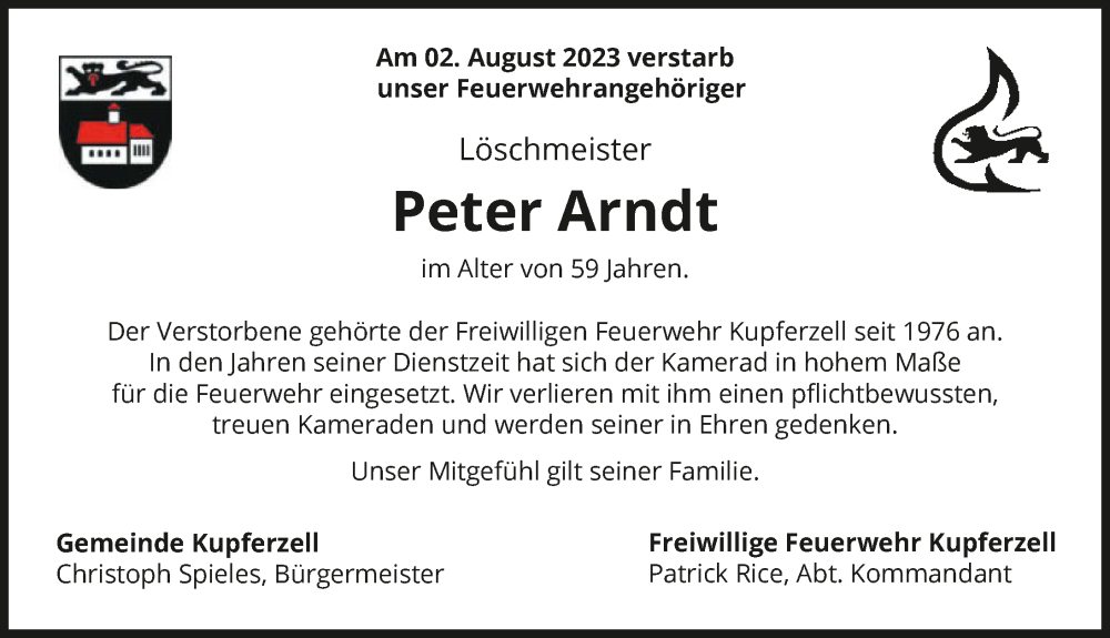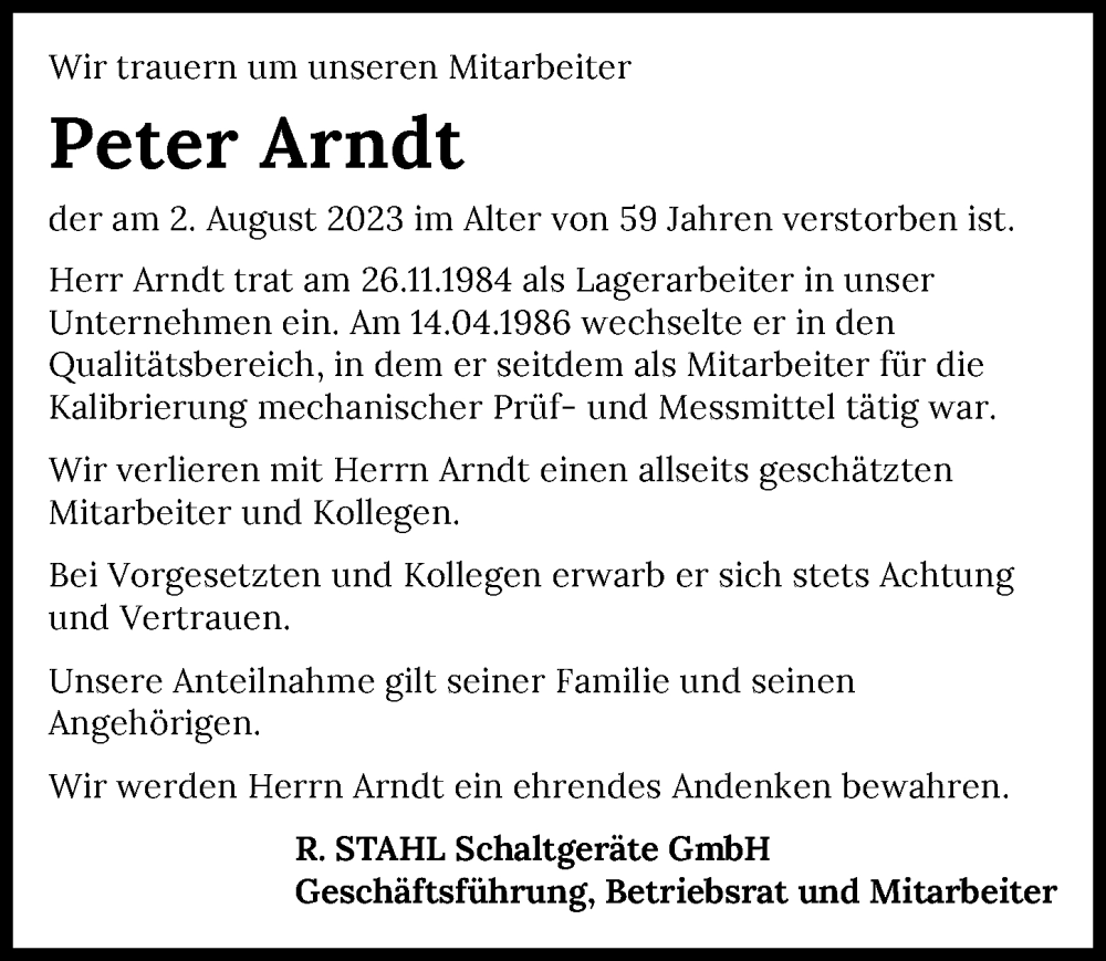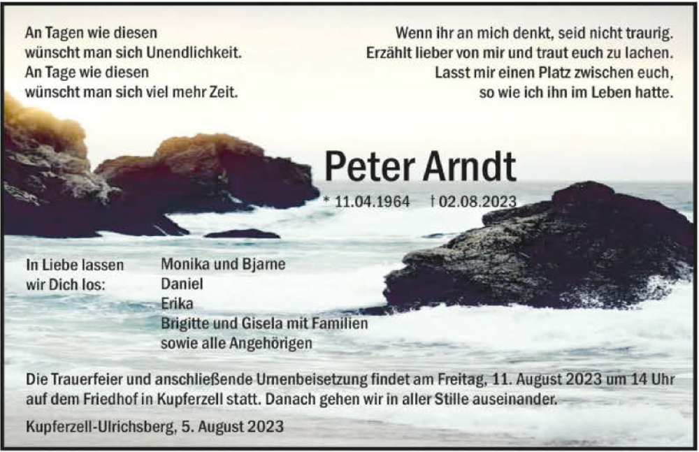 Hier finden Sie alle Traueranzeigen aus der Zeitung, die bisher für Peter Arndt erschienen sind. Weitere Traueranzeigen, die in der Zeitung erscheinen, werden hier ebenfalls aufgelistet