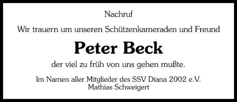Hier finden Sie alle Traueranzeigen aus der Zeitung, die bisher für Peter Beck erschienen sind. Weitere Traueranzeigen, die in der Zeitung erscheinen, werden hier ebenfalls aufgelistet