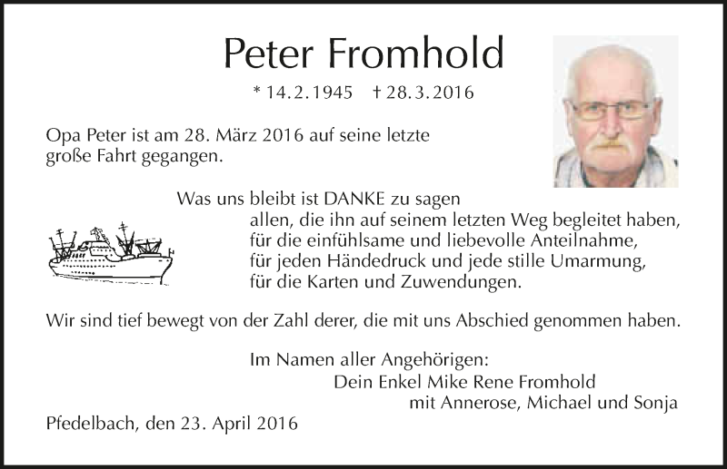 Hier finden Sie alle Traueranzeigen aus der Zeitung, die bisher für Peter Fromhold erschienen sind. Weitere Traueranzeigen, die in der Zeitung erscheinen, werden hier ebenfalls aufgelistet