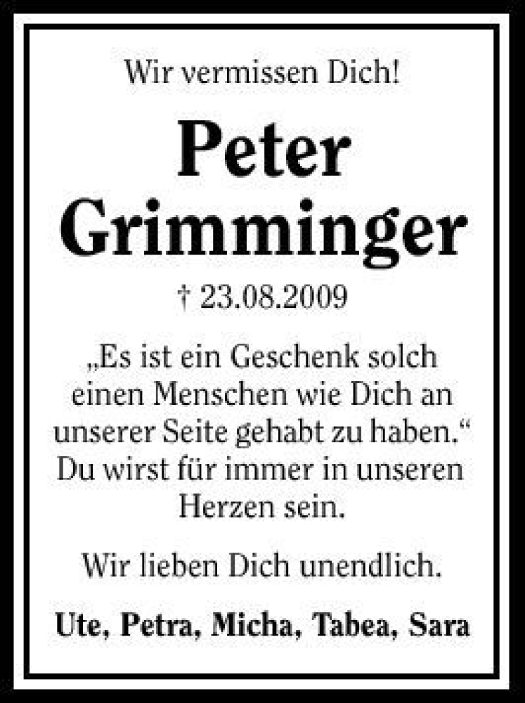 Hier finden Sie alle Traueranzeigen aus der Zeitung, die bisher für Peter Grimminger erschienen sind. Weitere Traueranzeigen, die in der Zeitung erscheinen, werden hier ebenfalls aufgelistet