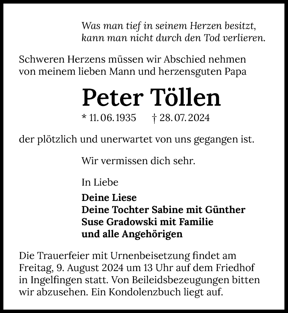 Hier finden Sie alle Traueranzeigen aus der Zeitung, die bisher für Peter Töllen erschienen sind. Weitere Traueranzeigen, die in der Zeitung erscheinen, werden hier ebenfalls aufgelistet