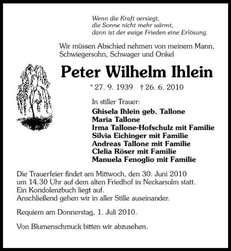 Hier finden Sie alle Traueranzeigen aus der Zeitung, die bisher für Peter Wilhelm Ihlein erschienen sind. Weitere Traueranzeigen, die in der Zeitung erscheinen, werden hier ebenfalls aufgelistet
