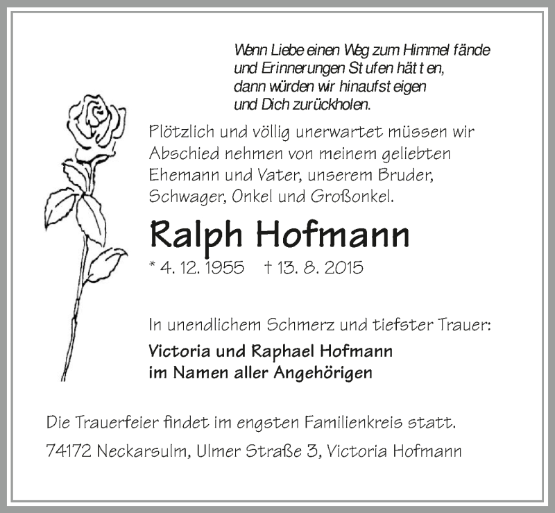 Hier finden Sie alle Traueranzeigen aus der Zeitung, die bisher für Ralph Hofmann erschienen sind. Weitere Traueranzeigen, die in der Zeitung erscheinen, werden hier ebenfalls aufgelistet