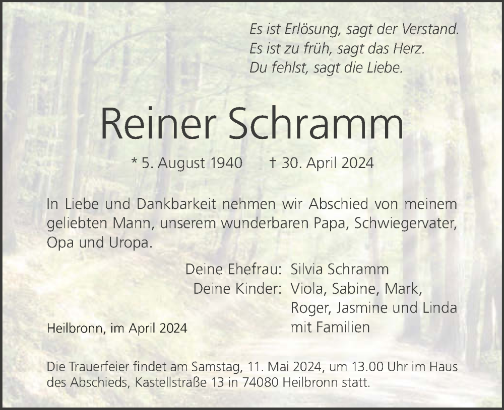Hier finden Sie alle Traueranzeigen aus der Zeitung, die bisher für Reiner Schramm erschienen sind. Weitere Traueranzeigen, die in der Zeitung erscheinen, werden hier ebenfalls aufgelistet