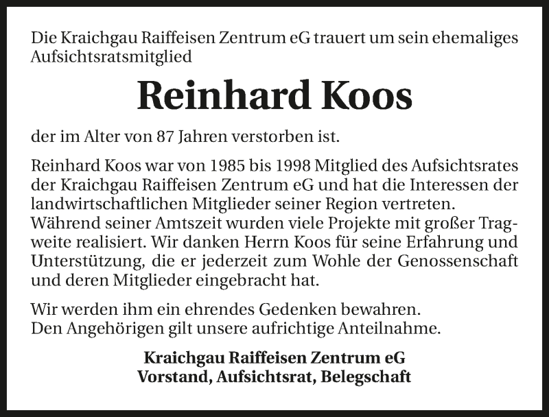 Hier finden Sie alle Traueranzeigen aus der Zeitung, die bisher für Reinhard Koos erschienen sind. Weitere Traueranzeigen, die in der Zeitung erscheinen, werden hier ebenfalls aufgelistet