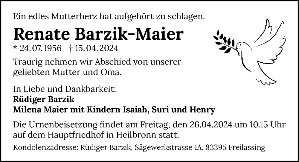 Hier finden Sie alle Traueranzeigen aus der Zeitung, die bisher für Renate Barzik-Maier erschienen sind. Weitere Traueranzeigen, die in der Zeitung erscheinen, werden hier ebenfalls aufgelistet