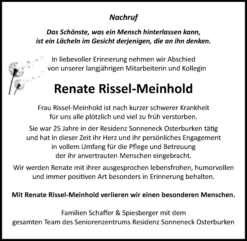 Hier finden Sie alle Traueranzeigen aus der Zeitung, die bisher für Renate Rissel-Meinhold erschienen sind. Weitere Traueranzeigen, die in der Zeitung erscheinen, werden hier ebenfalls aufgelistet