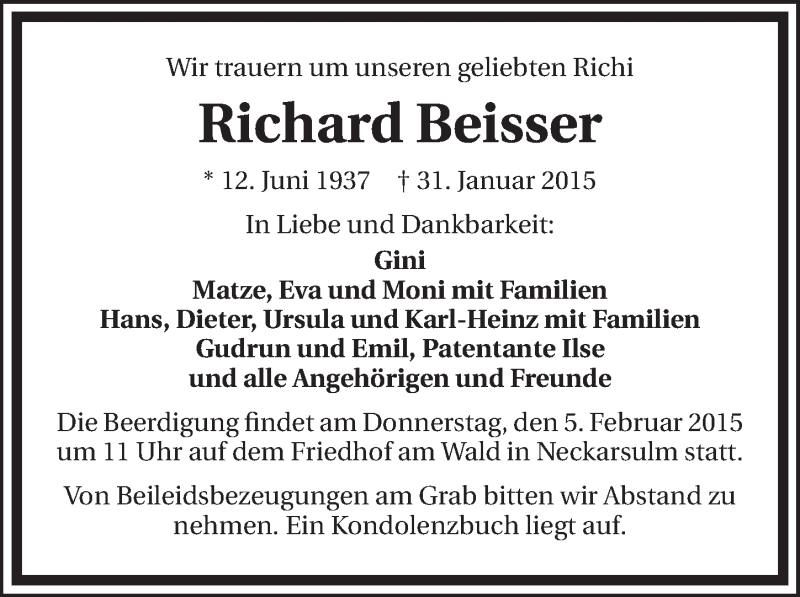 Hier finden Sie alle Traueranzeigen aus der Zeitung, die bisher für Richard Beisser erschienen sind. Weitere Traueranzeigen, die in der Zeitung erscheinen, werden hier ebenfalls aufgelistet
