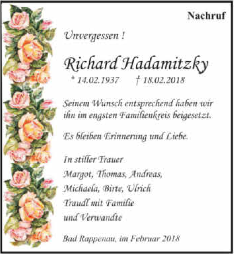 Hier finden Sie alle Traueranzeigen aus der Zeitung, die bisher für Richard Hadamitzky erschienen sind. Weitere Traueranzeigen, die in der Zeitung erscheinen, werden hier ebenfalls aufgelistet