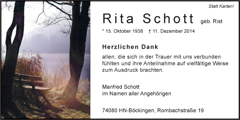 Hier finden Sie alle Traueranzeigen aus der Zeitung, die bisher für Rita Schott erschienen sind. Weitere Traueranzeigen, die in der Zeitung erscheinen, werden hier ebenfalls aufgelistet